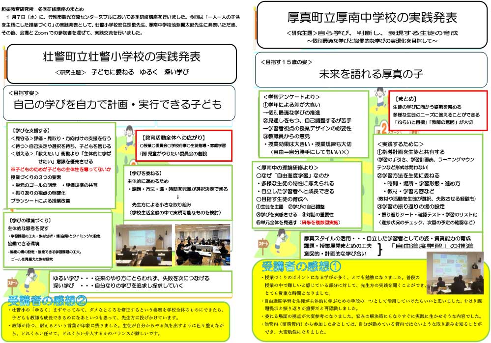 1月7日(水)に、登別市観光交流センターヌプルにおいて冬季研修講座を行いました。今回は「一人一人の子供を主語にした授業づくり」の実践発表として、壮瞥小学校安住理歌先生、厚南中学校池淵賢太郎先生に発表いただき、その後、会場とZoomでの参加者を混ぜて、実践交流を行いました。